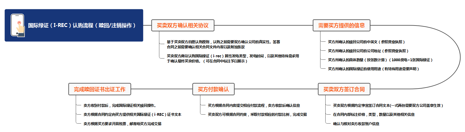大企業(yè)自身有賬戶的前提下,購(gòu)得國(guó)際綠證后一般會(huì)為自身完成贖回操作,而一些中小企業(yè)一般需要三方的代理機(jī)構(gòu)幫助其完成注銷/贖回操作。具體流程圖如下: